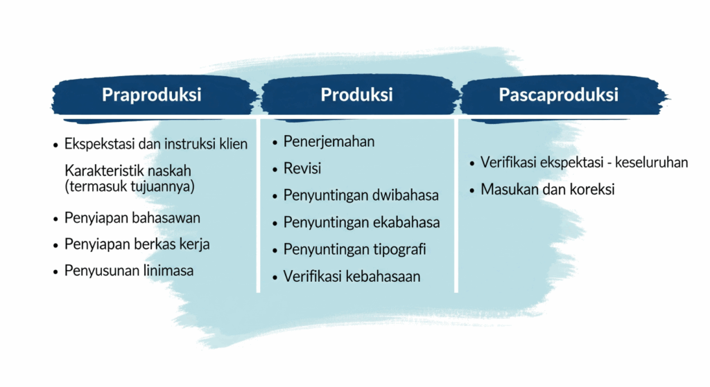 Proses pengelolaan proyek dapat dibagi ke dalam tiga tahap: pra-produksi, produksi, dan pasca-produksi. Tahap pra-produksi meliputi pendokumentasian ekspektasi dan instruksi klien, pendokumentasian karakteristik naskah (termasuk tujuannya), pencarian bahasawan yang tepat, dan persiapan berkas kerja. Di sini, studi kelayakan proyek akan berpengaruh besar pada kualitas yang dihasilkan dan kemampuan memenuhi ekspektasi klien.