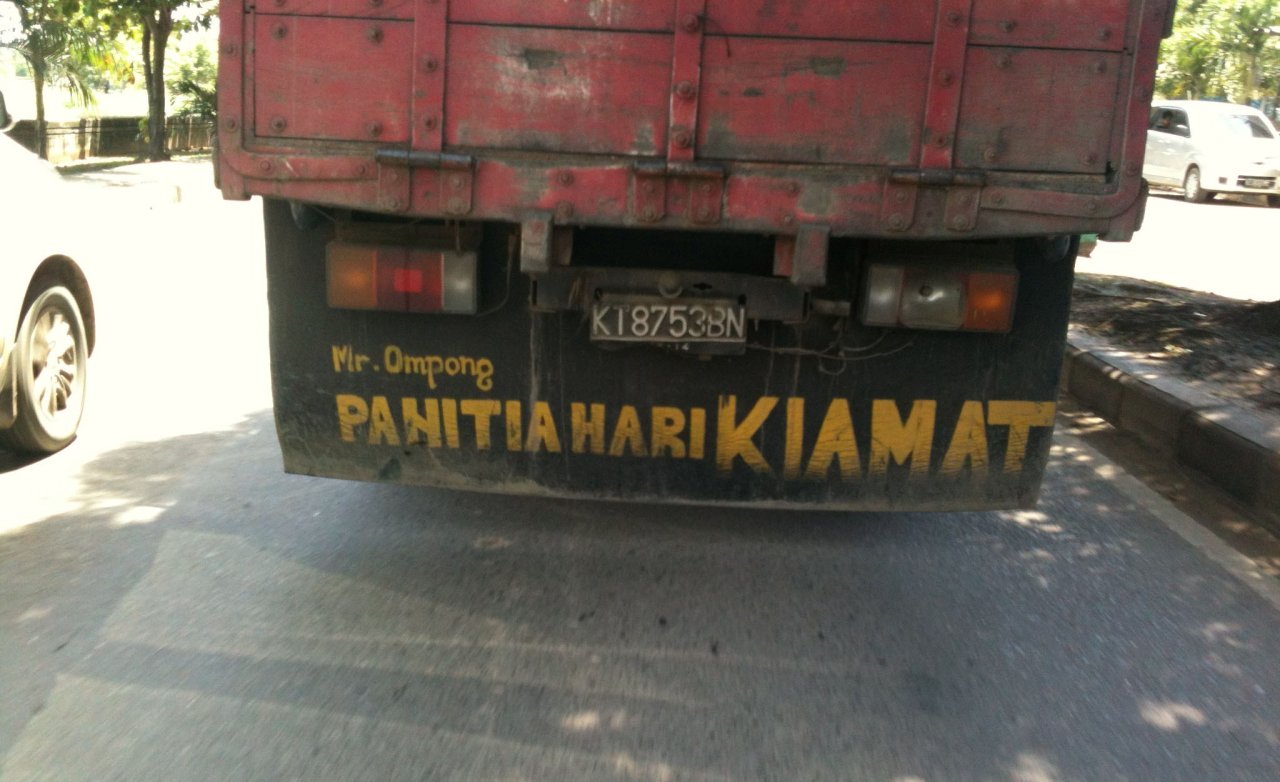 Tahu bagaimana membaca dan memahami frase JANDA 1/3 DIS, PRA ONE THE SAW, atau Air, Money & Chair? Bagi yang hidup berdekatan dengan tetangga yang jadi sopir atau kernet truk, atau yang rumahnya berdekatan dengan pangkalan truk, atau dekat dengan ‘studio’ lukisan bak truk, kata-kata di atas tidaklah asing lagi. Ya, tulisan-tulisan itu adalah hasil daya cipta seniman spesialis belakang truk. Di banyak blog, tulisan-tulisan dan gambar-gambar belakang truk (tepatnya di bak sisi belakang truk) dipajang dengan kata pengantar yang bunyinya rata-rata begini: ‘silahkan tersenyum…” Bahkan, kini telah ada grup jenis kesenangan di Facebook yang memuat dan berbagi tulisan-tulisan dan gambar-gambar belakang truk. Seberapa menarikkah tulisan-tulisan dan gambar-gambar itu? Apa yang membuatnya menarik? Kira-kira apa fungsinya? (Artikel ini akan fokus pada tulisan saja, meskipun gambar akan sedikit disinggung demi pemahaman yang lebih lengkap mengenai fenomena ini).